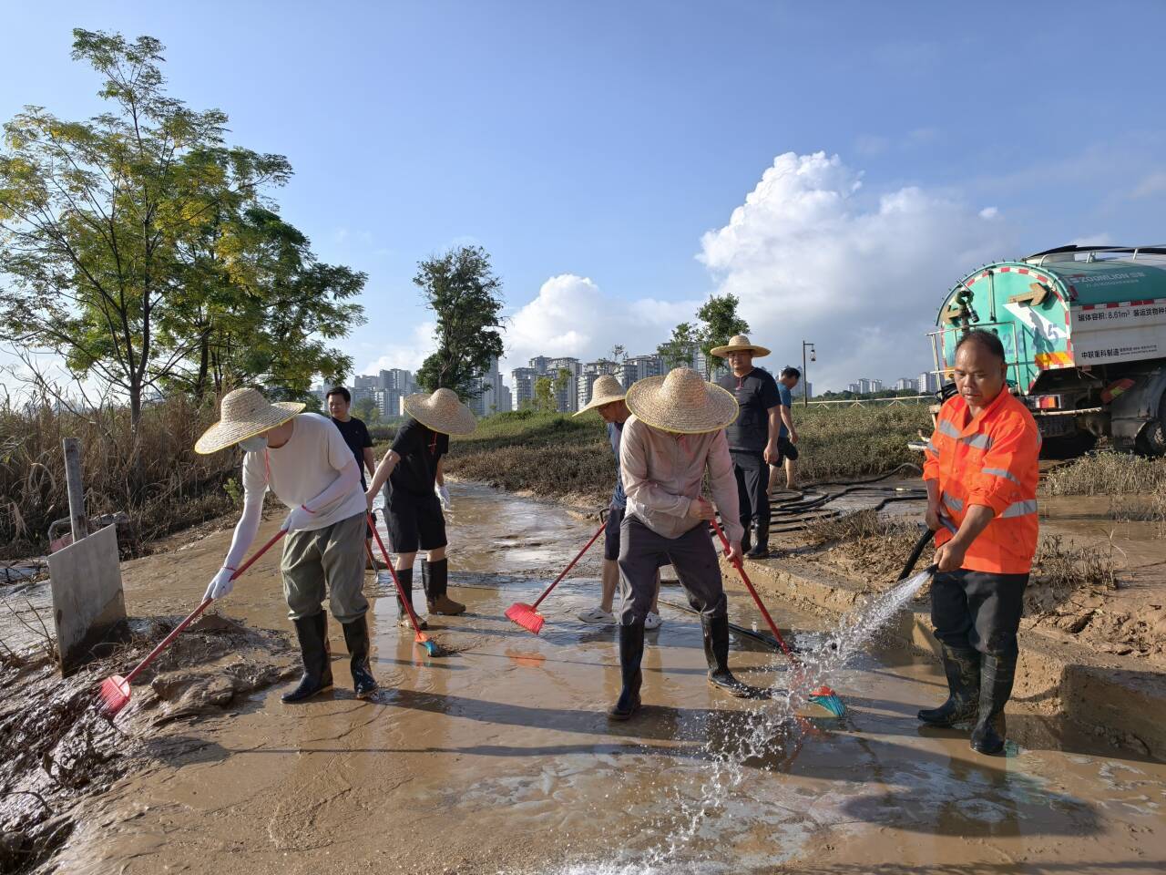 上午8點(diǎn),志愿者們攜帶鐵鏟、刮泥板、掃帚、垃圾袋等工具,準(zhǔn)時在指定區(qū)域集合?,F(xiàn)場的淤泥最深處達(dá)10余厘米,腳一踩便陷進(jìn)去難以拔出,鏟子剛插進(jìn)泥里就被牢牢黏住。“大家分工干,先刮表層泥,再清垃圾!” 隨著一聲號召,志愿者們迅速分組行動:有的彎腰緊握刮泥板,順著步道紋理反復(fù)刮除黏連的淤泥;有的扛著水管,利用高壓水槍沖刷地面;有的拎著垃圾袋,蹲下身細(xì)致?lián)焓安卦诓菘p里的垃圾;有的則推著清運(yùn)車,來回穿梭將裝滿淤泥和垃圾的袋子及時運(yùn)離現(xiàn)場…… 各個環(huán)節(jié)銜接緊密、井然有序。盡管天氣炎熱,汗水順著臉頰滑落、浸透衣衫,志愿者們的熱情與干勁絲毫未減,充分展現(xiàn)了國企的責(zé)任與擔(dān)當(dāng)。